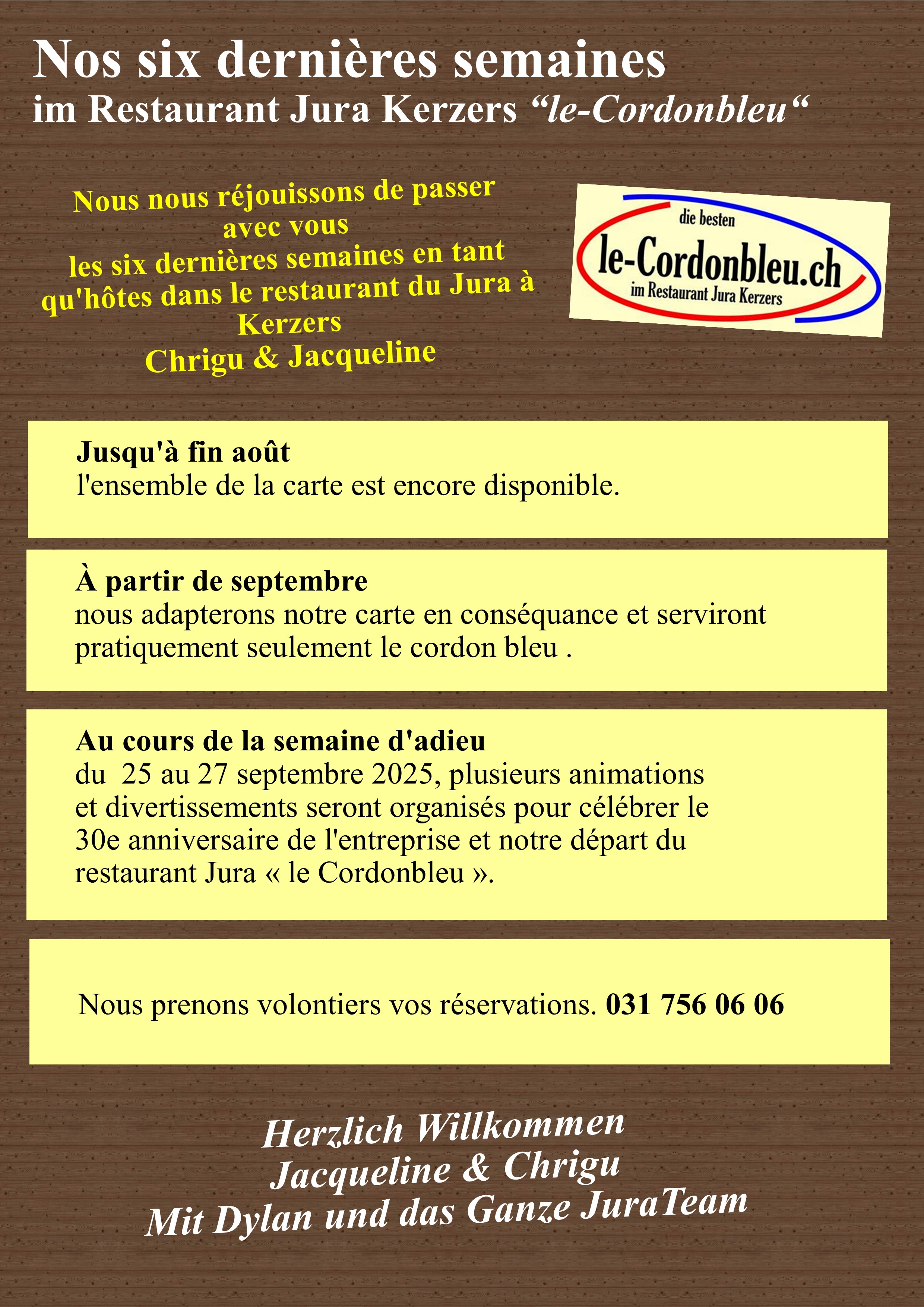 Gerne nehmen wir Ihre Take away (Cordonbleu zum mitnehmen) sehr gerne entgegen. Bitte beachten Sie das ein Cordonbleu eine gewisse Zubereitungszeit benötigt. DANKE für Ihre frühzeitige Vorbestellung. (auf Karte klicken ) Bezüglich Allergene geben unsere Mitarbeiter gerne weiterführende Auskünfte, jedoch können wir für Allergiker keine Anpassungen machen. (Generell Take Away Jura: Bitte Entschuldigen Sie = Wir können für Allergiker für Take Away keine Anpassungen machen.)